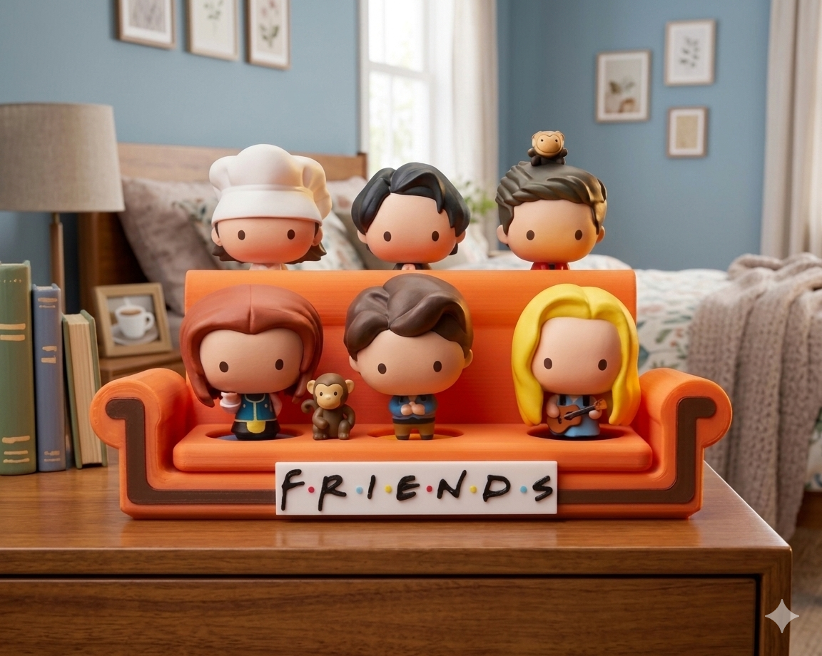 O suporte funciona como um figurine holder e toy organiser, com compartimentos individuais para manter cada figura na vertical e organizada, sendo ideal para prateleiras, mesas, expositores de colecionadores ou qualquer espaço de desk display. É um presente incrível como tv fan gift para quem ama séries clássicas, 90s tv decor e pop culture decor.